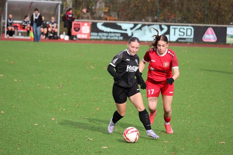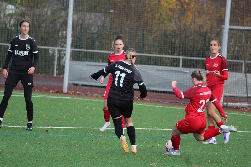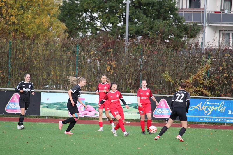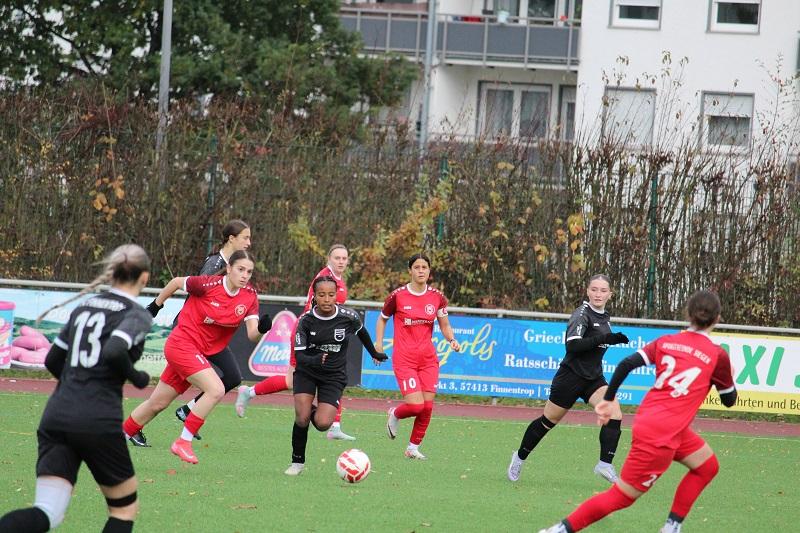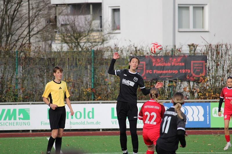 Mehr Frauenfußballtradition geht in dieser Region kaum. Die Vereine FC Finnentrop und Sportfreunde Siegen stehen für Erfolg über Jahrzehnte. Heute standen sich beide Vereine im Ligaspiel der Bezirksliga gegenüber. Es war eine ausgeglichene Begegnung, wobei beide Teams Probleme hatten, gefährliche Torgelegenheiten zu kreieren. Die Gäste aus dem Siegerland erwiesen sich als zweikampfstark und für den FC Finnentrop als der erwartet robuste Gegner. In der 13. Minute konnte Lena Berghoff einen Konterangriff zum 1:0 für die Heimmannschaft vollenden. Es dauerte bis zur 38. Minute, bis die Sportfreundinnen zum Ausgleich durch Lea Sophie Hebel trafen. Die FC-Defensive konnte die Situation nur ungenügend klären. Letztendlich hatte sich SF Siegen den Ausgleichstreffer verdientermaßen erarbeitet. Der FC Finnentrop zeigte sich aber nicht geschockt, sondern konnte noch vor der Halbzeit in der 43. Minute durch Lena Berghoff die erneute Führung erzielen.