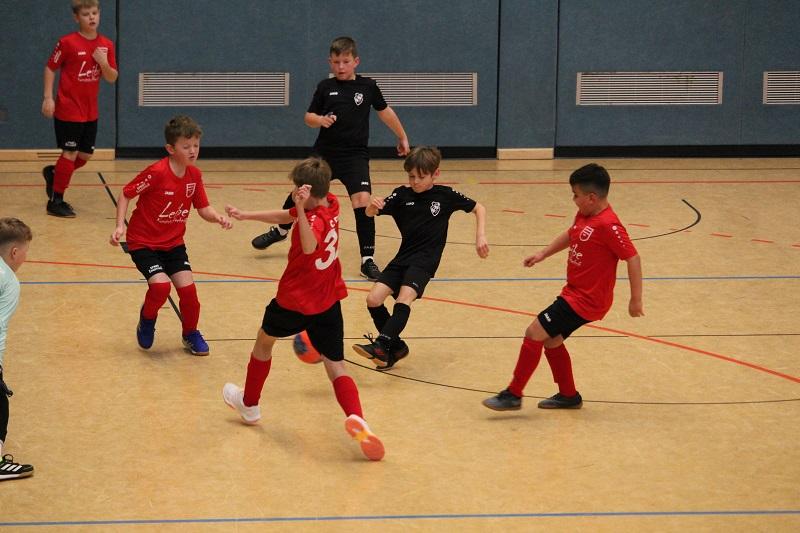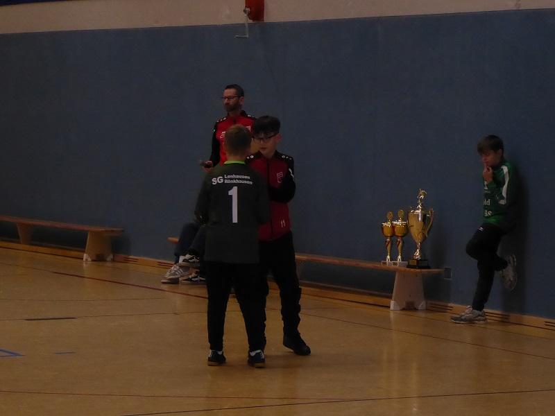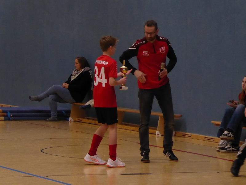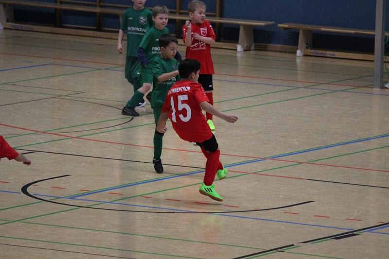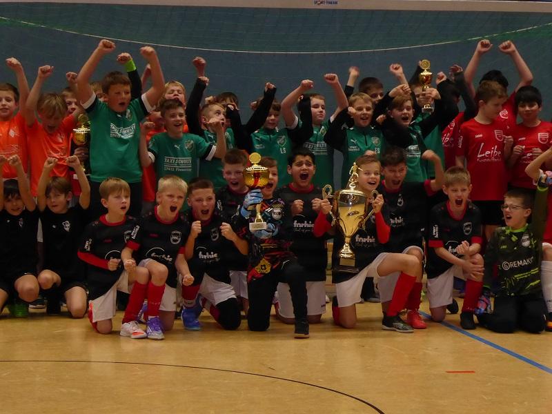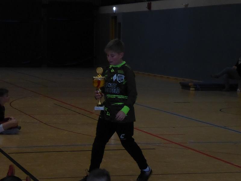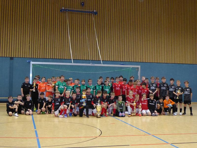 Auch das zweite Hallenfußballturnier des Tages, das Turnier der E-Junioren, wurde im Modus Jeder-gegen-Jeden ausgespielt. Teilnehmer waren die Teams des SV Heggen, SpVg Olpe, FC Finnentrop, RW Lennestadt-Grevenbrück, JSG Hünsborn/Rothemühle, SG Lenhausen/Rönkhausen und JSG Dünschede/Helden. Nach spannenden Spielen konnte am Ende RW Lennestadt-Grevenbrück das Turnier für sich entscheiden und den E-Junioren-Wanderpokal des FC Finnentrop erringen. Die abschließende Siegerehrung wurde vom Jugendleiter des FC Finnentrop, René Liedmann, durchgeführt, wobei jedes Team mit einem Pokal ausgezeichnet wurde.
