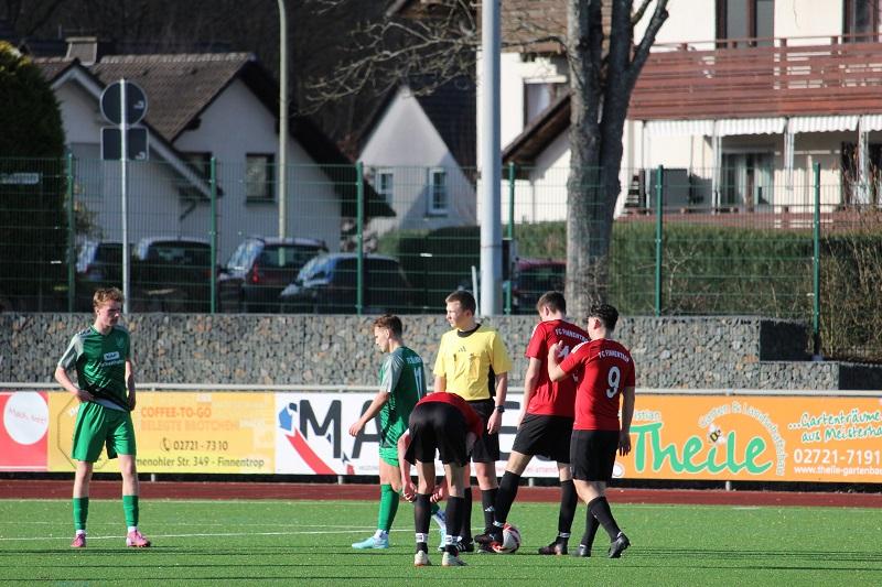 Trainer Eugen Litter hatte hinreichend vor dem Gegner gewarnt. Schon im Hinspiel hatte sich der FC Finnentrop sehr schwergetan. Das war auch heute so. Nach zehn Minuten führten die Gäste durch einen Treffer von Jan Schneider. Die Heimmannschaft hatte Mühe ins Spiel zu finden. Immerhin gelang Jannis Scheermann in der 33. Minute der 1:1-Ausgleich. Besserung schien in Sicht, aber noch vor der Pause schlug Möllmicke wieder zu. In der 38. Minute verwandelte Jan Schneider einen Foulelfmeter zur erneuten Gästeführung.